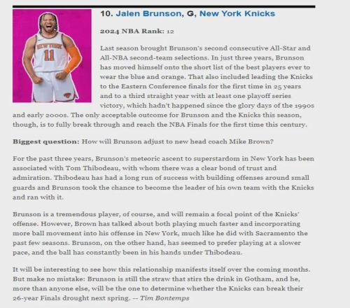在赛季初ESPN评选的NBA百大球星中,布伦森排名第10,在东部所有球员中高居第2,仅低于排名第4的字母哥,网站评语如下: