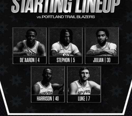 首发阵容方面,开拓者队这边,格兰特(左脚跟腱炎)、亨德森(左腿筋撕裂)、霍勒迪(右小腿扭伤)、利拉德(左跟腱伤病)、塞布尔(右膝肌腱炎)、韦斯利(右脚骨折)和罗威(左膝伤病管理)等7人缺席,教练排出的最新首发五人组为: 夏普、卡马拉、默里、阿夫迪亚、克林根;马刺队这边,文班亚马(左膝酸痛)、瓦塞尔(左侧内收肌拉伤)缺阵,首发阵容则为:福克斯、卡斯尔、尚帕尼、巴恩斯、科内特。