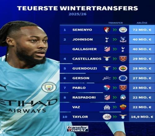 2025-26赛季冬季转会窗已经开启大约半个月时间,德国转会市场盘点了球员的转会费情况,塞梅尼奥7200万欧最高,布伦南·约翰逊和加拉格尔均4000万欧并列次席。以下为2025-26赛季冬窗球员转会费排行:
