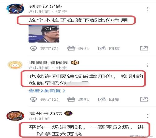 和许利民的“特别相信”范子铭不同,网友们可不惯着他,赛后纷纷吐槽道“在场10分钟输了19分。”;“师傅你是做什么工作的?”;“放个木桩子在篮下都比你有用。”;“也就许利民铁饭碗敢用你,换别的教练早把你坐穿板凳了”;“平均一场进两球,一赛季50多场,进一球拿五六万块。”;“这是顶薪球员的表现?下载个反 诈中心吧!”;“我姐上去,防守比你强一百倍,真的,不吹牛。”……